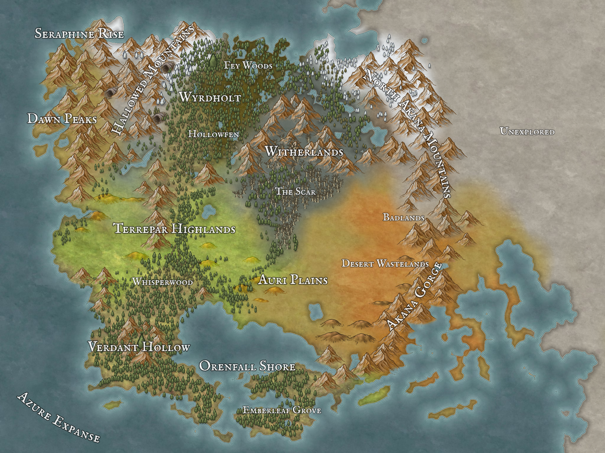 Certain regions are already named, but this massive continent features all types of biomes and zones, and some of the land is still unexplored. Landmarks and strongholds will be added when the info about the regions is expanded, read more under Planned Features, the current map is to give a general idea of where each bloodline originates from and for upcoming stories and questlines to take place.